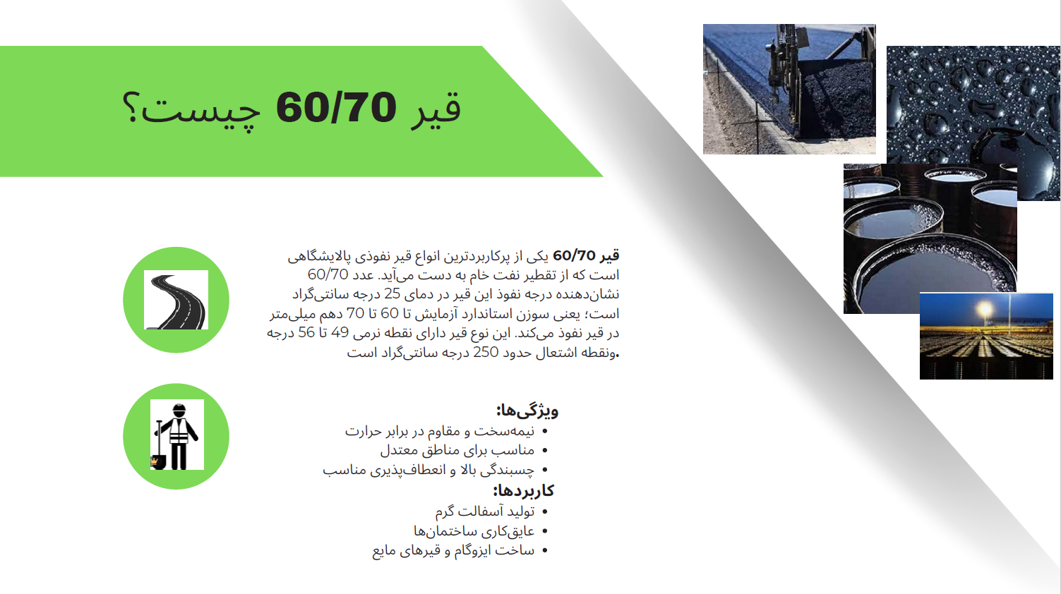قیر 60/70 یکی از پرکاربردترین انواع قیر نفوذی پالایشگاهی است که از تقطیر نفت خام به دست میآید. عدد 60/70 نشاندهنده درجه نفوذ این قیر در دمای 25 درجه سانتیگراد است؛ یعنی سوزن استاندارد آزمایش تا 60 تا 70 دهم میلیمتر در قیر نفوذ میکند. این نوع قیر دارای نقطه نرمی 49 تا 56 درجه و نقطه اشتعال حدود 250 درجه سانتیگراد است.